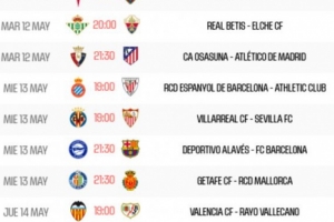 體育資訊4月21日訊 西甲官方公布了第36輪賽程安排,馬競、巴薩和皇馬將分別在北京時間5月13日、14日和15日凌晨出戰。
